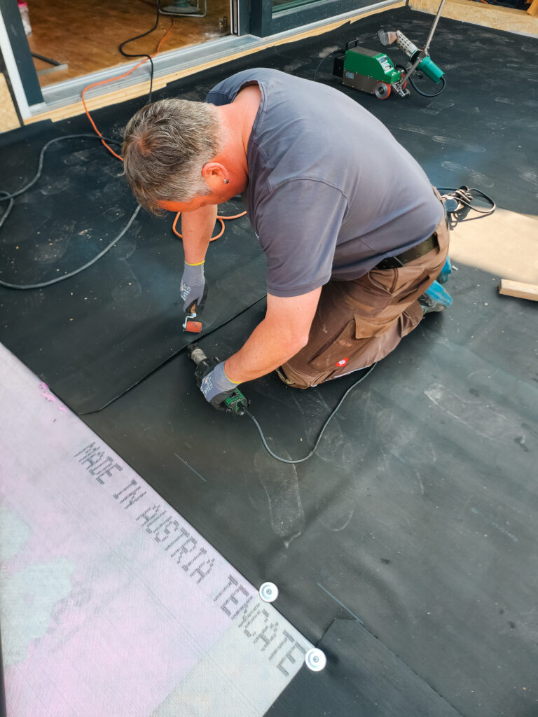 Eine große Fläche abzudichten, ist relativ einfach und lässt sich schnell umsetzen. Zusätzliche Herausforderungen entstehen jedoch durch Anschlussbereiche der Dachentwässerung sowie durch zahlreiche technische Anlagen, die auf Dächern montiert werden. Dazu zählen unter anderem Satellitenschüsseln, Wärmepumpen, Lüftungsanlagen sowie Solar- und Photovoltaikanlagen.
